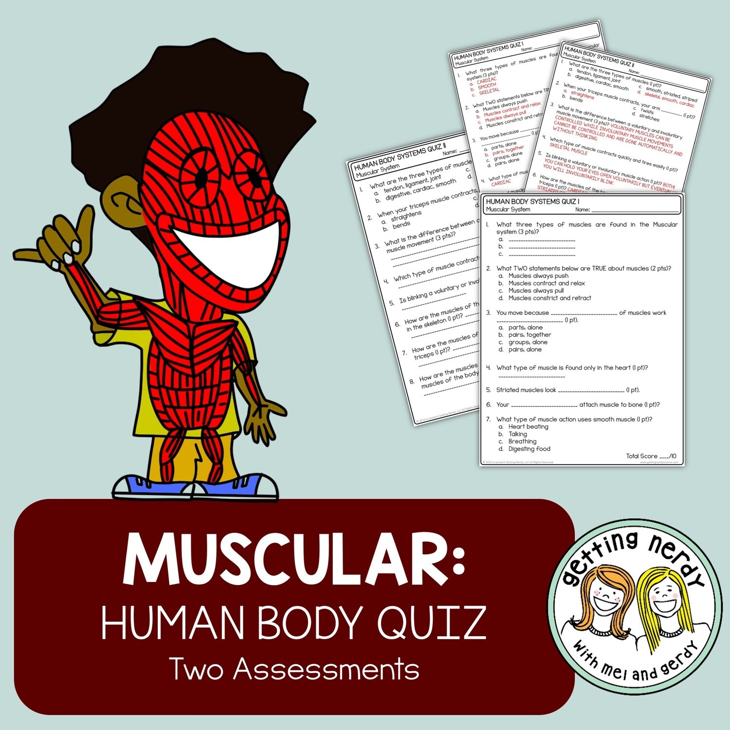 Looking for a human body quiz to test your science students' knowledge of the muscular system? Our Muscular System Quiz Pack is jam-packed with TWO quizzes containing multiple choice and short answer questions that are thoughtfully crafted to cover the various muscle tissues and their functions. This quiz pack is the perfect way to wrap up your own unit on the muscular system or can be used with our Getting Nerdy Curriculum.